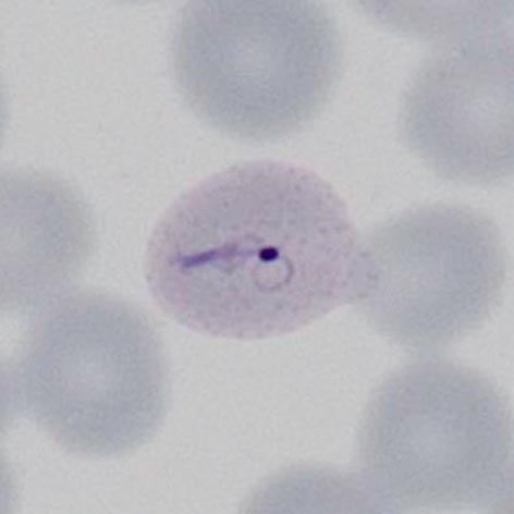 Some parasite forms are typical though not exclusive of the species, these include: accolé forms, double chromatin dot forms, and multiple parasites within infected red cells.